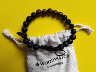Elegante bracciale Woodwatch da uomo con pietre vulcaniche e legno marrone. La chiusura è in metallo nero. Mai usato.