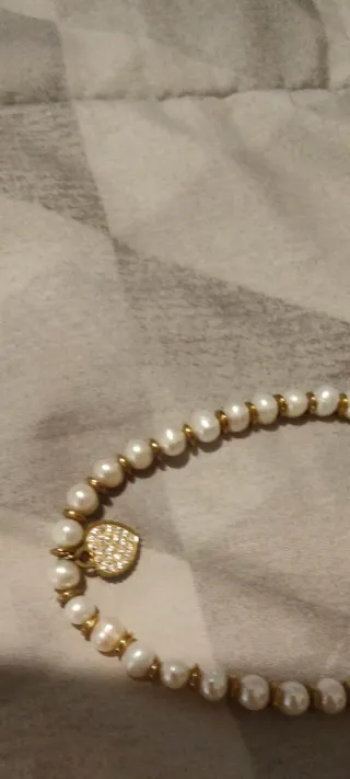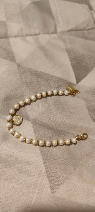 Elegante bracciale con perle e un ciondolo a forma di cuore. - Perle bianche naturali. - Dettagli in metallo dorato. - Ciondolo a cuore scintillante.