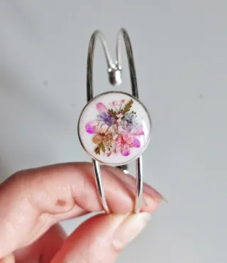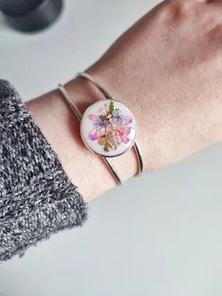 Delicato bracciale regolabile in acciaio inossidabile con un ciondolo rotondo incastonato con veri fiori secchi. - Ciondolo con fiori misti.