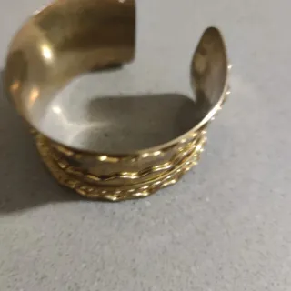 Elegante braccialetto rigido con una finitura dorata. - Design a fascia larga. - Motivi ondulati e intrecciati lungo i bordi. - Apertura per facilitare l'indossamento.