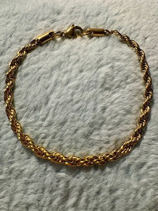 Braccialetto donna unisex effetto corda intrecciata color oro. Realizzato in acciaio inossidabile. Nuovo, mai usato e in perfette condizioni. Lunghezza 20cm, larghezza maglia 4mm. 🚚 Spedizione in 24h
