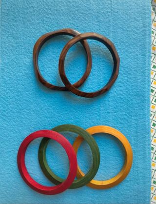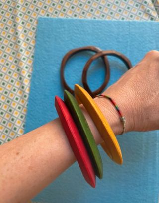 Set di bracciali, due in legno e tre colorati. - Bracciali in legno effetto grezzo. Uno di questi presenta un graffio profondo ma non è rotto. - Bracciali colorati in rosso, verde e giallo. Sono in perfetto stato