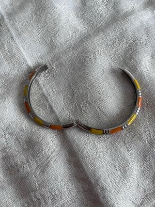 Elegante bracciale rigido in metallo. - Design colorato con inserti arancio e giallo. Vendo perché mi è stato regalato ma è troppo largo pet mio polso. Diametro interno 6 cm. Chiusura con gancio a scatto molto comoda e perfettamente funzionante.
