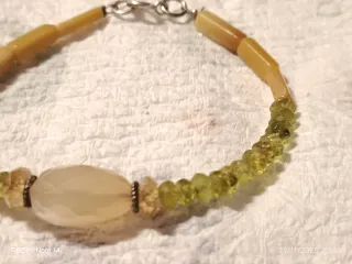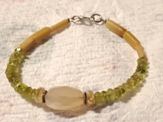 Elegante bracciale realizzato con pietre dure naturali. Quarzo rosa centrale, peridoto verde, quarzo citrino e quarzite gialla. - Perle sfaccettate verdi. - Chiusura a moschettone in metallo argentato. Lunghezza cm.18