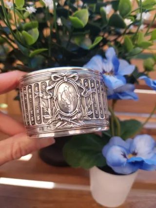 Ex portatovagliolo del XIX secolo con iniziali dell'antica proprietaria, trasformato in bracciale. Argento punzonato. - Design classico con dettagli in rilievo. - Motivo centrale con fiocco e cornice ovale. - Bordi decorati con motivi a colonna.