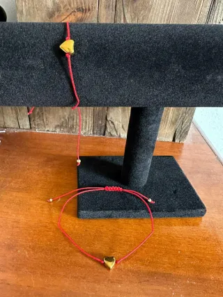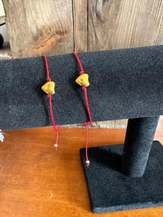 Delicato braccialetto con un ciondolo a forma di cuore in oro e un filo rosso. Perfetto per un tocco di eleganza. Il prezzo si intende per singolo braccialetto. - Ciondolo a forma di cuore. - Filo rosso regolabile. - Dettaglio con piccola perlina dorata.