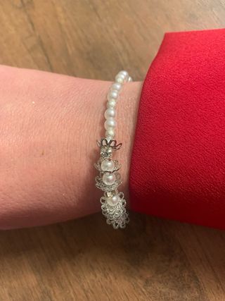 Delicato bracciale artigianale realizzato con perle e ciondoli a forma di angelo. - Perle bianche. - Ciondoli a forma di angelo in metallo argentato. - Dettagli luminosi.