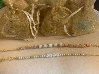 Set di bracciali fatti a mano con perline. - Perline bianche piatte. - Perline dorate. - Perle bianche. - Lettere LOVE bianche con scritte dorate. 15 euro la coppia , a scelta.