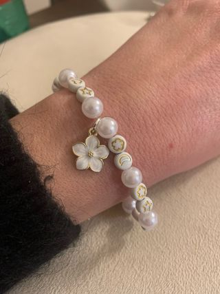 Delizioso bracciale artigianale con perline. - Perline bianche lucide. - Charm a forma di fiore bianco. - Decorazioni a forma di luna e stelle dorate.