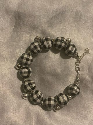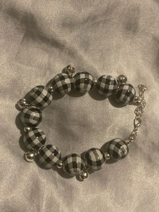 Bracciale fatto a mano con perle a quadretti. - Perle grandi a fantasia. - Dettagli metallici. - Chiusura a moschettone.