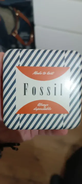 Bracciale da uomo Fossil, con un design a righe blu e bianche. La scatola presenta la scritta Made to last e Always dependable. - Scatola in metallo con fantasia a righe. - Logo Fossil in rilievo.