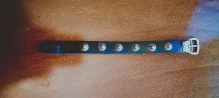 Bracciale in pelle nera con dettagli metallici. - Sei borchie rotonde argentate. - Chiusura a fibbia in metallo argentato. Lunghezza 21 cm Larghezza 1.5 cm 6 borchie