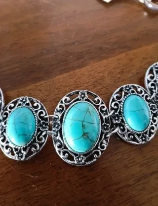 Elegante bracciale argentato con elementi turchesi. Comprato in negozio etnico. Mai usato. - Design con pietre ovali. - Dettagli in metallo argentato.