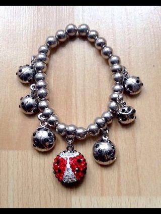 Grazioso braccialetto con charms a forma di coccinella. - 7 charms a coccinella. - Perline argentate. - Un charm centrale decorato con strass rossi e bianchi.