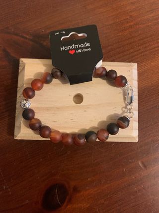 Elegante bracciale con pietre dure naturali e dettagli in argento. Elastico. - Pietre dure naturali di colore rosso. - Elementi decorativi in argento. - Ciondolo a forma di cono metallico.