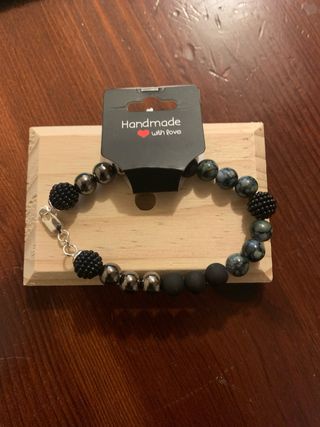 Elegante bracciale realizzato con pietre dure naturali nere e dettagli in argento. Elastico. - Pietre dure naturali nere. - Ciondoli a forma di stella, foglia e cuore. - Elementi decorativi in argento.