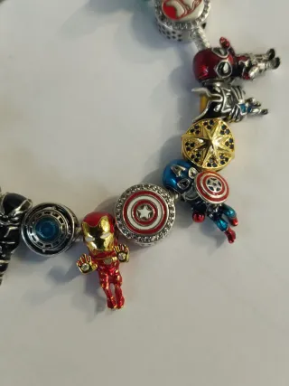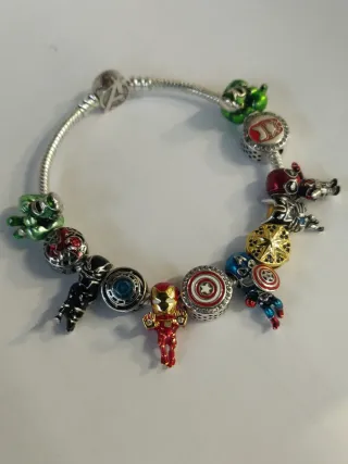 Bracciale in argento con diversi charm a tema Avengers. Non so se tutti Pandora ma alcuni hanno la scritta Marcati 925 - Charm di Iron Man, Captain America, Black Panther e Hulk. - Charm con logo Avengers. - Charm a forma di scudo di Captain America. - Charm con stella dorata.