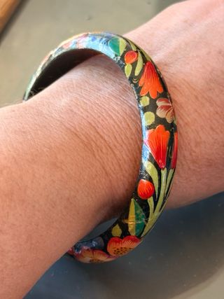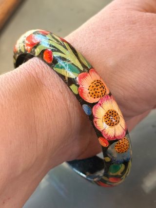 Bracciale rigido vintage anni 70, in legno dipinto a mano. Lavorazione dell'artigianato del Kashmir (India), noti per i loro intricati motivi floreali e le finiture laccate. Ottime condizioni vintage, alcune piccole imperfezioni all'interno del bracciale dovute al tempo e all'uso che però non ne compromettono minimamente la bellezza è la portabilità Ti invito a guardare con attenzione le foto che sono parte integrante della descrizione Diametro 7 cm Altezza 1,5 cm