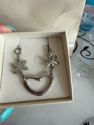 Delicato bracciale in acciaio con ciondoli a forma di cuore e fiorellini. Un'idea regalo graziosa. - Materiale: acciaio. - Design: cuore centrale con fiori laterali.