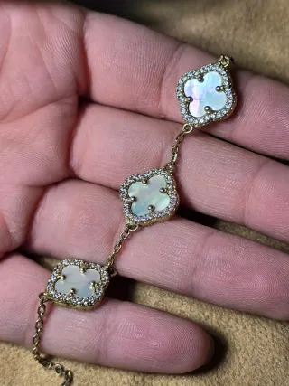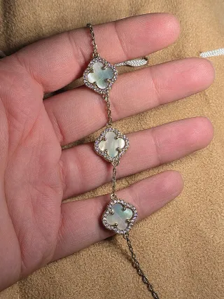 Elegante bracciale con tre pendenti a forma di quadrifoglio, in argento 925. - Placcato oro. - Decorato con madreperla e zirconi scintillanti. - Design raffinato e luminoso.