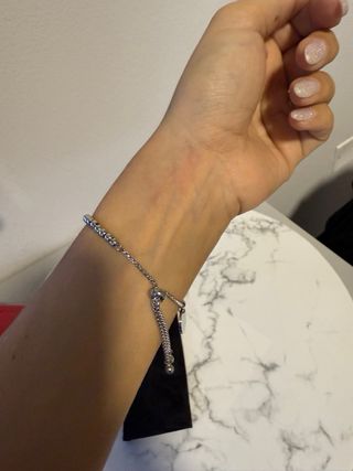 Elegante bracciale regolabile con un ciondolo rotondo. - Materiale: acciaio inox - Design a catena. - Chiusura scorrevole per una vestibilità personalizzata. - Due sfere decorative alle estremità della catena.