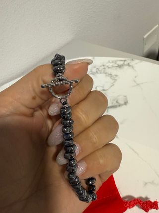 Elegante bracciale da uomo con pietre nere e chiusura a T. - Pietre nere sfaccettate. - Chiusura a T in metallo argentato. - Design moderno e versatile.
