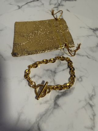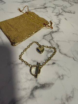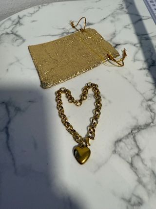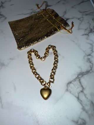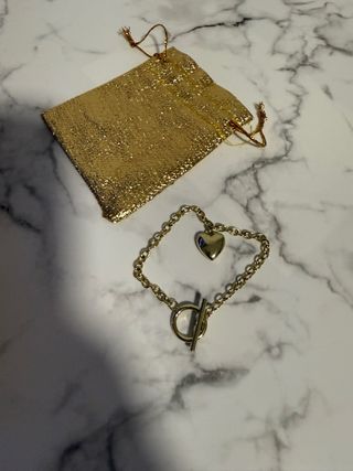 Elegante bracciale con un ciondolo a forma di cuore. - Design a catena spessa. - Chiusura a moschettone. - Include una sacca porta gioielli dorata.