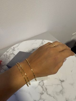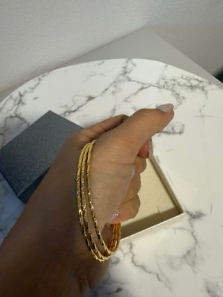 Set di tre bracciali rigidi placcati oro 18kt. Hanno una finitura testurizzata che cattura la luce. - Placcatura in oro 18kt. - Design rigido. - Finitura testurizzata.