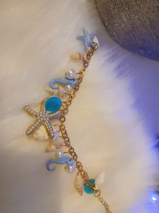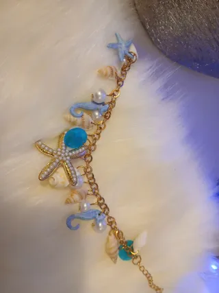 Delizioso bracciale a tema marino, perfetto per aggiungere un tocco estivo al tuo look. - Charm a forma di stelle marine, cavallucci marini e conchiglie. - Perle decorative. - Dettagli color acquamarina.