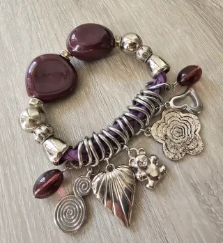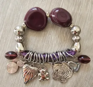Elegante bracciale elastico con dettagli bordeaux e argento. - Perle grandi color bordeaux. - Elementi decorativi a forma di foglia, orsetto, rosa e cuore. - Pendenti a spirale e ovali. - Filo elastico resistente.