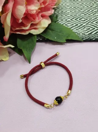 Elegante braccialetto con su Coccu, un simbolo tradizionale. Perfetto per aggiungere un tocco di stile. - Cordino resistente di colore rosso. - Dettagli e chiusura in metallo dorato. - Pietra centrale nera. - Design regolabile.