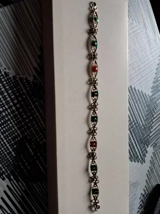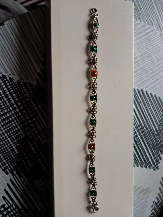 Elegante bracciale in argento con un design raffinato. - Pietre incastonate a forma di goccia. - Alternanza di pietre verdi e rosse. - Dettagli floreali tra le maglie.