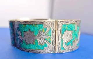 Elegante bracciale in Argento Sterling 925 con inserti in turchese. - Design con motivi floreali e decorazioni cesellate. - Chiusura a scatto in argento Bracciale Argento Sterling 925 E Smalti Cesellato A Mano. 925 Sterling Silver and Hand-Chiseled Enamel Bracelet.