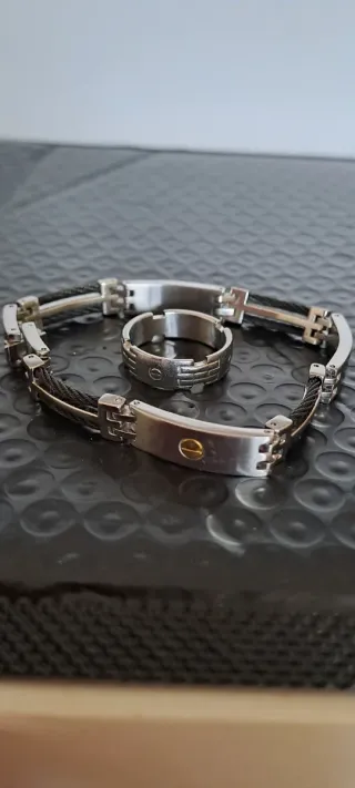 Elegante set composto da bracciale e anello. - Materiale: acciaio. - Design moderno con inserti neri. - Dettaglio dorato sul bracciale.