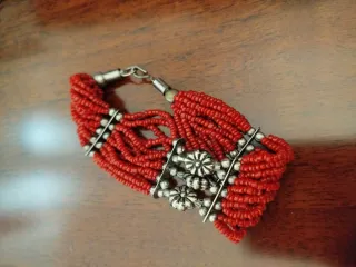 Elegante braccialetto realizzato con numerosi fili di corallini rossi. Presenta dettagli decorativi in metallo argentato che aggiungono un tocco di raffinatezza. - Design multistrato con corallini. - Elementi decorativi in metallo color argento.