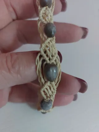 Braccialetto fatto a mano con tecnica macramè e piccole pietre incastonate. Un accessorio unico per aggiungere un tocco speciale al tuo stile. - Realizzato con cordino beige. - Decorato con pietre grigie. - Chiusura regolabile con nodi.