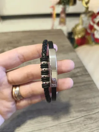 Elegante bracciale da uomo con design moderno. - Lunghezza 21,5 cm - Materiale: acciaio inossidabile e ecopelle nera. - Dettagli: inserti metallici e cordino intrecciato.