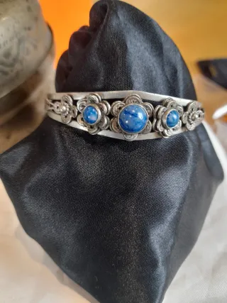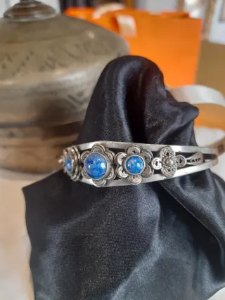Elegante bracciale con pietre di lapislazzuli incastonate. - Design floreale in metallo. - Dettagli lavorati a mano.