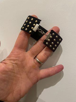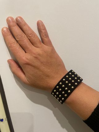 Bracciale da polso con borchie dorate su base nera. - Design punk e rock.