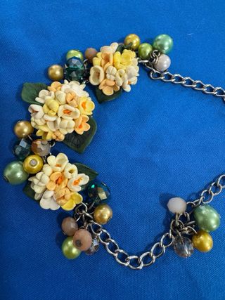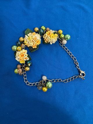 Delicato braccialetto decorato con fiori gialli e verdi e perline colorate. - Fiori in giallo e bianco fatto a mano, lavorazione di alta qualità. - Foglie verdi. - Perline di varie dimensioni e tonalità. - Chiusura a moschettone regolabile.
