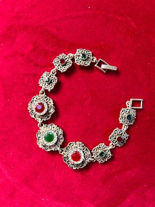 Elegante bracciale vintage con un design floreale e pietre incastonate. - Dettagli in metallo argentato. - Alternanza di pietre rosse e verdi. - Chiusura a moschettone.