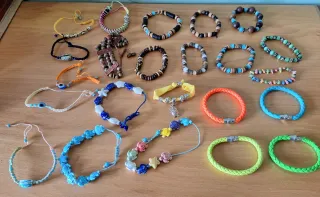 Lotto di braccialetti con vari design e colori vivaci. - Braccialetti con perline e ciondoli a tema marino. - Braccialetti intrecciati con elementi in legno e turchese. - Braccialetti in corda intrecciata con chiusura a calamita.