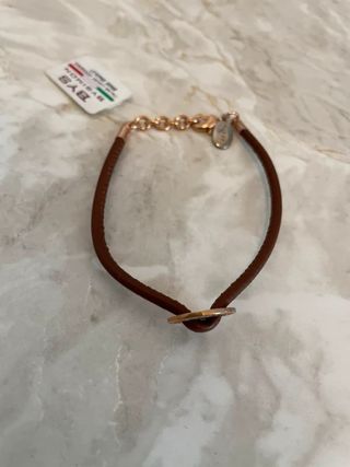Elegante bracciale BY SIMON, nuovo e mai indossato. - Realizzato con una corda in pelle marrone. - Dettagli in metallo color oro. - Chiusura a moschettone regolabile.