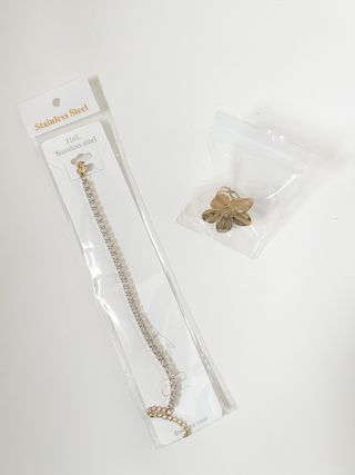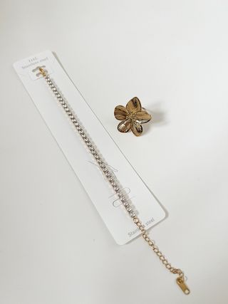 Braccialetto tennis dorato (non è oro ovviamente) nuovo con punzone “s. steel” come da foto Anello con fiore in acciaio (misura fiore 3 cm) diametro anello 17 mm Vendo insieme al prezzo totale indicato. Accetto offerte!