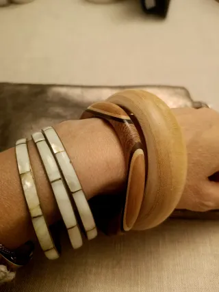 Set di cinque bracciali rigidi in stile vintage. - Bracciali in legno con inserti. - Bracciali in ottone con dettagli in madreperla.