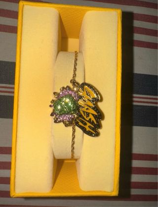 Braccialetto con ciondolo a forma di pugno di Hulk, decorato con pietre verdi e viola. - Ciondolo a forma di pugno di Hulk. - Dettagli in smalto nero e giallo. - Catena dorata.