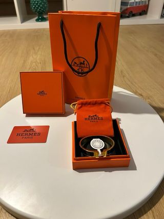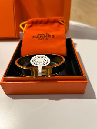 Elegante bracciale Hermès con finiture in oro e nero. - Misura 19cm. - Design iconico con chiusura a H. - Completo di sacchetto protettivo e scatola originali. -spedizione massimo 24h