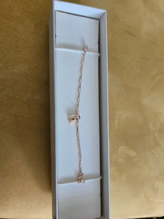 Bracciale Polvere di Sogni – Argento 925 placcato oro rosa 18 kt Bracciale nuovo, completo di cartellino prezzo e scatola originale, appartenente alla collezione Polvere di Sogni. Realizzato con catena a maglie lucide in argento 925, placcato oro rosa 18 kt. Elemento centrale ricoperto dallo speciale materiale “Polvere di Sogni”, ottenuto dalla lavorazione di materiali naturali minerali, che dona un effetto luminoso ed elegante. Perfetto come regalo o per impreziosire qualsiasi outfit con un tocco raffinato.