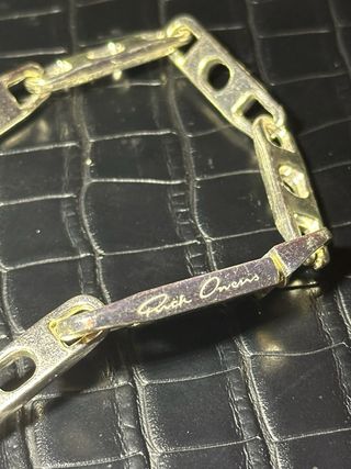 Bracciale unisex firmato Rick Owens dal design forte e immediatamente riconoscibile. Un pezzo iconico, industriale, essenziale 🖤 Il metallo ha effetto “usato” voluto, parte integrante del design originale. Non ci sono segni di usura: la finitura è così di fabbrica. Struttura solida, maglie rigide e finitura argento opaca. Firma “Rick Owens” incisa sulla piastrina centrale. Al polso ha una presenza netta e decisa. Lunghezza totale circa 20 cm (visibile in foto con metro) - La lunghezza può essere accorciata. Perfetto da solo o abbinato ad altri accessori dallo stile dark / industrial.
