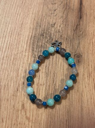 Elegante bracciale elastico con perle colorate e un grazioso charm a forma di farfalla. - Perle di varie tonalità di blu e grigio. - Charm a forma di farfalla in metallo. - Elastico resistente per una facile vestibilità.